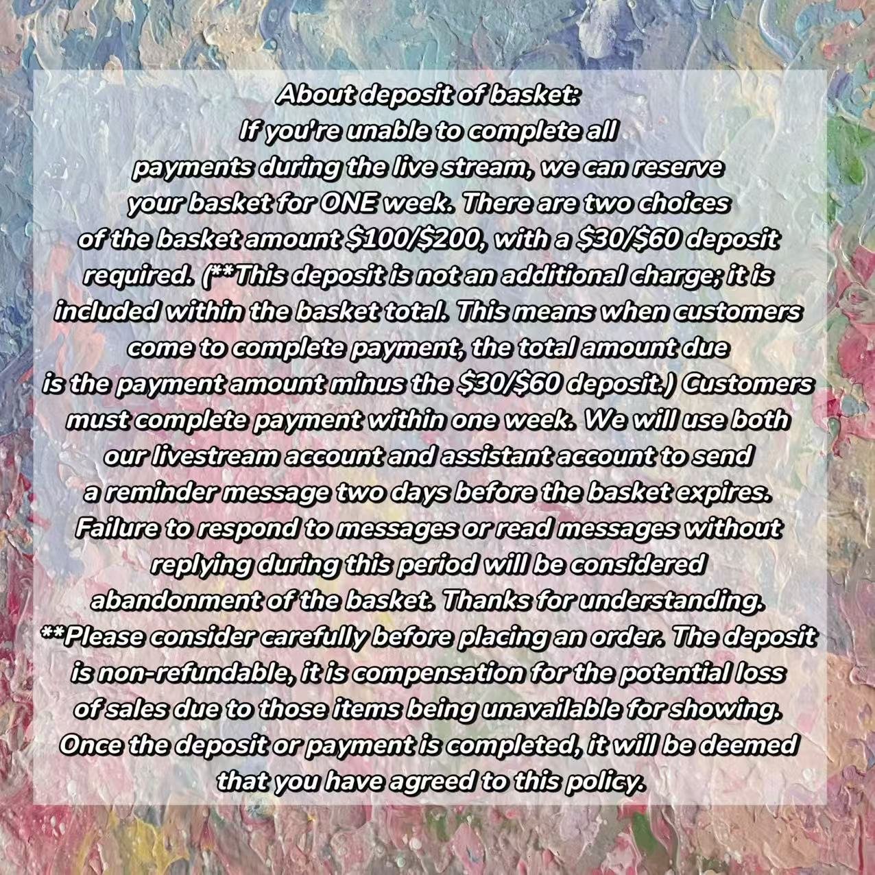 About deposit of basket: If you’re unable to complete all payments during the live stream, we can reserve your basket for ONE week. There are two choices of the basket amount $100/$200, with a $30/$60 deposit required. (**This deposit is not an additional charge; it is included within the basket total. This means when customers come to complete payment, the total amount due is the payment amount minus the $30/$60 deposit.) Customers must complete payment within one week. We will use both our livestream account and assistant account to send a reminder message two days before the basket expires. Failure to respond to messages or read messages without replying during this period will be considered abandonment of the basket. Thanks for understanding. **Please consider carefully before placing an order. The deposit is non-refundable, it is compensation for the potential loss of sales due to those items being unavailable for showing. Once the deposit or payment is completed, it will be deemed that you have agreed to this policy.